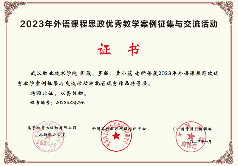 学校教师获2023年外语课程思政优秀教学案例征集与交流活动湖北优秀作品特等奖