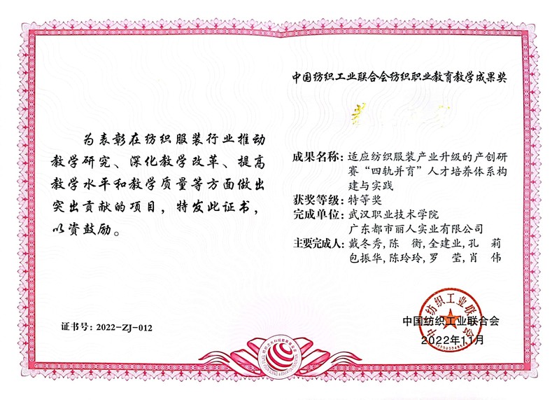 《适应纺织服装产业升级的产创研赛“四轨并育”人才培养体系构建与实践》获中国纺织工业联合会纺织职业教育教学成果奖特等奖