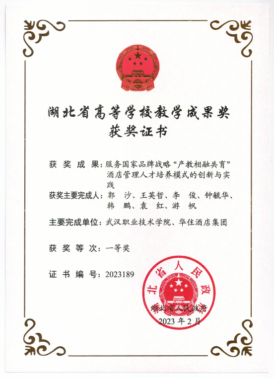 《服务国家品牌战略“产教相融共育”酒店管理人才培养模式的创新与实践》获湖北省高等学校教学成果一等奖