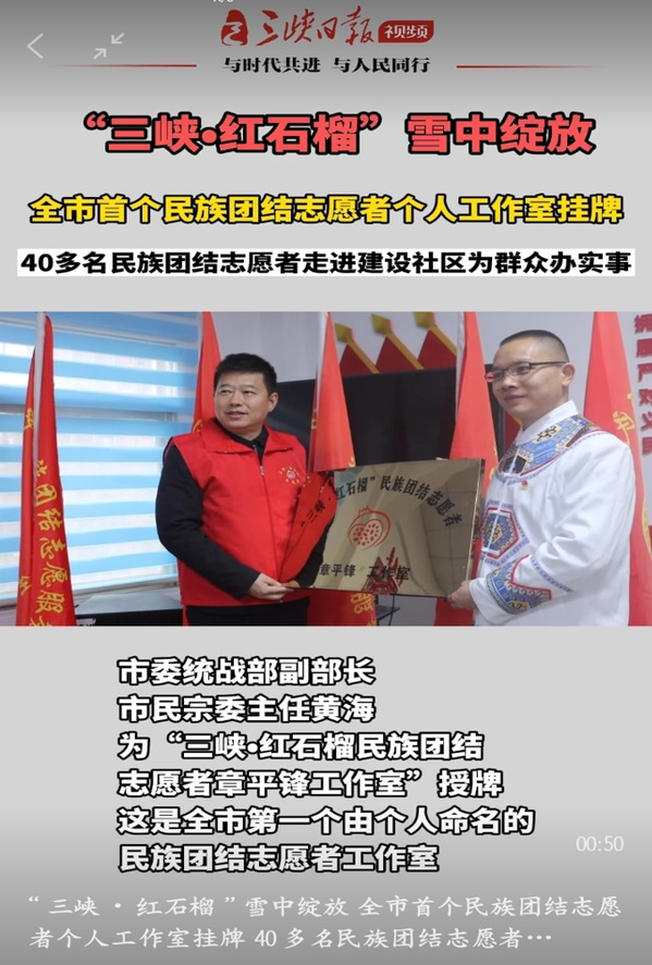 2022年1月,宜昌首个以个人名字命名的“三峡・红石榴民族团结志愿者章平锋工作室”揭牌。志愿服务队设有“筑爱暖心”“健康养生”“环境保护”等5支小分队,章平锋担任“筑爱暖心”小分队队长。志愿服务队每月固定开展志愿活动不低于两次,年度志愿服务次数不低于20次,已开展志愿服务活动200余次。章平锋组织发起的志愿服务活动投入现金、物资近20万元,直接帮扶人数近200人。
