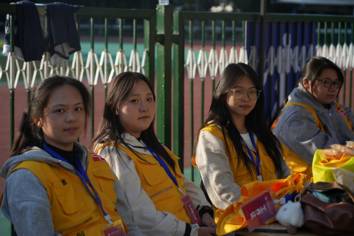 赛场上青春飞扬,赛场外的温暖同样值得被定格。艺术设计学院志愿者们穿着亮色志愿服,像一群灵动的“小太阳”穿梭在各个角落:有人蹲在补给点,把矿泉水摆成整齐的“小方阵”;有人举着能量棒,眼睛紧紧盯着终点线。刚跑完1500米的一名选手,冲线后因体力不支有些眩晕,志愿者立刻递上矿泉水,旁边兄弟学院的志愿者快步跟过来,剥开一瓣清甜的柚子递过去 —— 不同学院的志愿者身影凑在一起,像一幅暖融融的“校园互助速写”,让赛场溢满家人般的温柔。