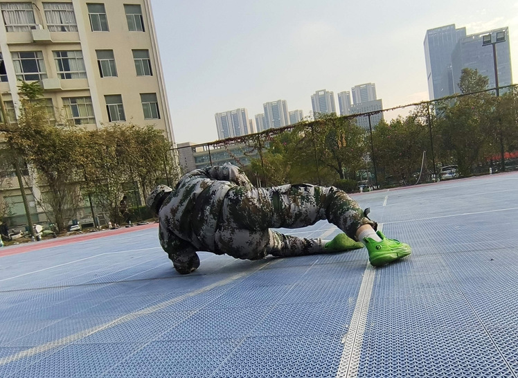 训练时手机突然“冒泡”,机设25401班王圣男迎来了一场特殊的“低姿匍匐秀”。教官一声令下,他快速卧倒在训练场上慢慢向前挪动,认真又带点可爱的架势,活像一只努力前行的小迷彩虫。