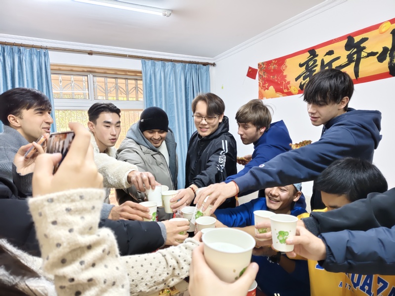 来自乌兹别克斯坦的凯文尝着热气腾腾的饺子,开心地分享:“我最喜欢的中国美食就是饺子,今天了解到它象征着团圆与吉祥,吃起来更有意义了。”来自哈萨克斯坦的文奕雄在尝到新疆特色馕饼时,当即想起了家乡的传统面食,兴奋地和大家分享着两地面食的相似之处,还不时拿起手机记录下聚餐的温馨场景,让这份跨文化的味觉共鸣与节日喜悦,随镜头定格。